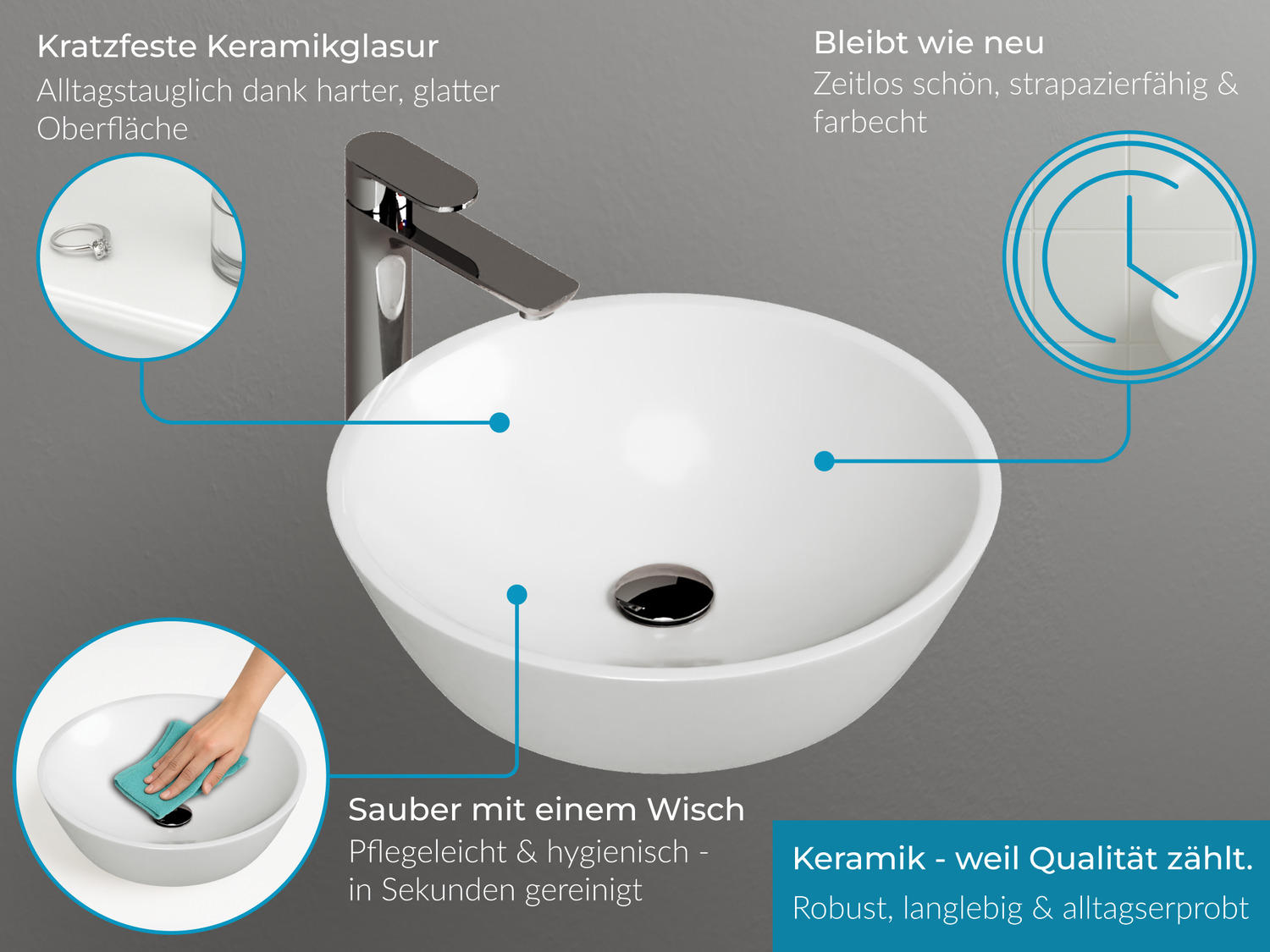 Moderne Waschbecken aus bester Keramik Ein Waschbecken soll heutzutage nicht nur funktional sein, sondern auch den optischen Ansprüchen Genüge leisten, beiden Punkten wird dieses Keramikbecken gerecht. Der Werkstoff Keramik steht für eine hohe Beständigkeit gegenüber den täglichen Herausforderungen denen er sich im Bad stellen muss. Durch die spezielle Brenntechnik von über 1200° Grad ist die Glasur der Aqua Bagno Waschtische besonders geschützt vor Kratzern und Farbveränderungen, auch weist die feinporigste Oberfläche Schmutz besonders gut ab.