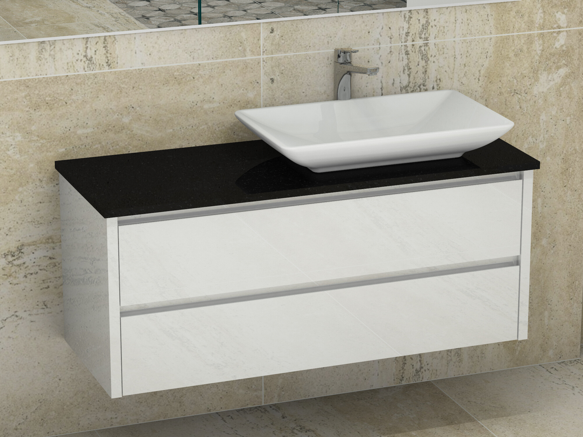 Mit der Kombination aus Keramik, Holz-Unterschrank und Naturstein schafft Aqua Bagno einen absoluten Hingucker in jedem Badezimmer, durch die natürliche Beschaffenheit der Trägerplatte wird die Badmöbelkombination sogar zu einem Unikat.