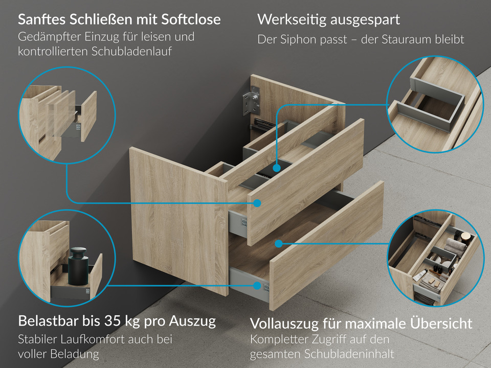 Das Badmöbel macht direkt einen hochwertigen Eindruck! Die Schubladen fühlen sich stabil an und laufen superleicht dank des Soft-Close-Mechanismus – kein lautes Zuschlagen mehr.