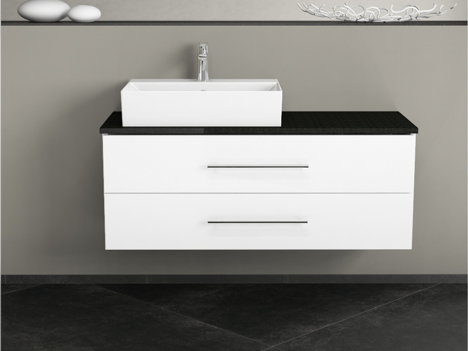 Aqua Bagno Badmöbel Flex 118cm Breite mit einem Keramik Waschtisch KS.60 (links ausgerichtet), Granit Trägerplatte und Unterschrank Weiß Hochglanz Lackiert, zwei Auszüge
