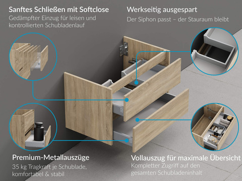 Neben der Farbe können Sie zudem die Eigenschaften des Unterschrankes wählen. Wie viele Schubladen soll das Modell haben und welcher Griff gefällt Ihnen am besten? Sie entscheiden!