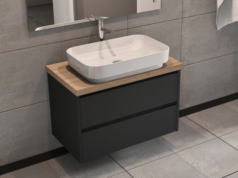 Für die Aufsatzwaschbecken setzen wir auf hochwertige Markenkeramik, die leicht zu reinigen und besonders robust ist. Weiß ist hier die klassische Farbe und kommt besonders schön auf dunklen Trägerplatten zur Geltung. Ihr Vorteil bei der Kombination aus Trägerplatte und Waschtischunterschrank: Die Waschbecken passen perfekt zur Waschtischplatte und dem Schrank und müssen nicht einzeln ausgewählt werden.