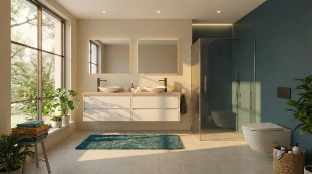 Die Badgestaltung 2026 orientiert sich verstärkt an Konzepten, die Erholung und Komfort verbinden. Warme, dimmbare LED-Beleuchtung sorgt für eine beruhigende Stimmung, während großzügige Spiegel den Raum optisch erweitern.