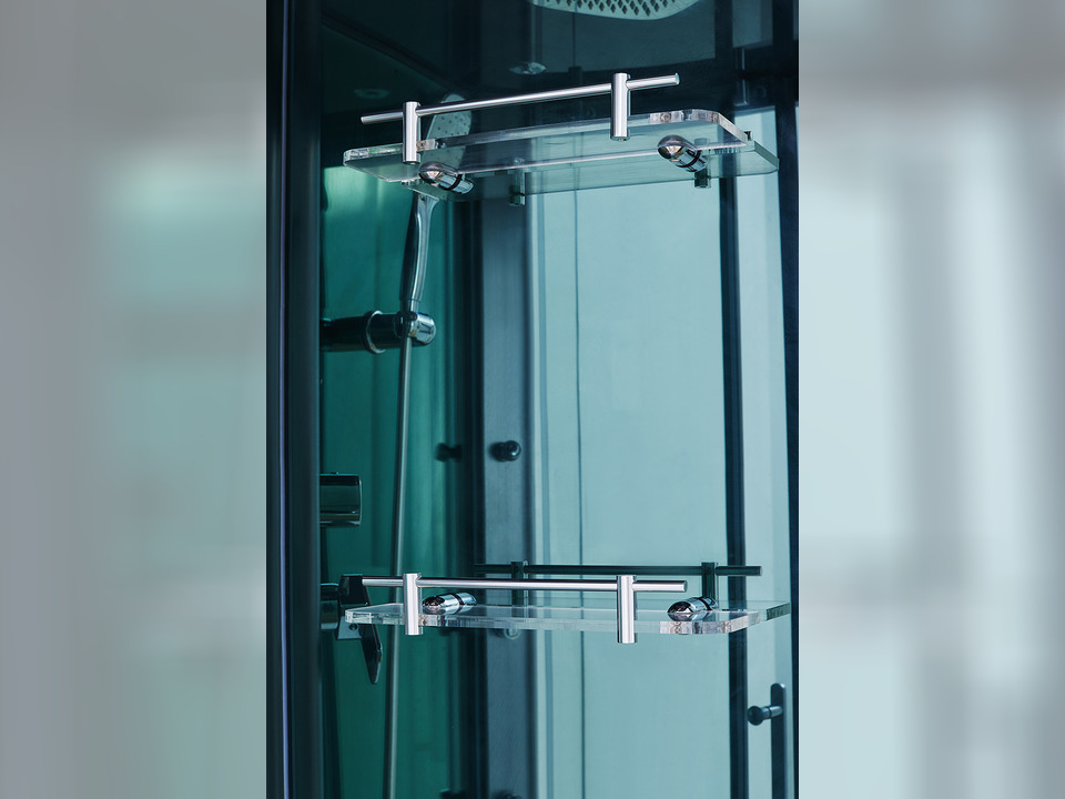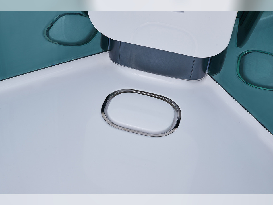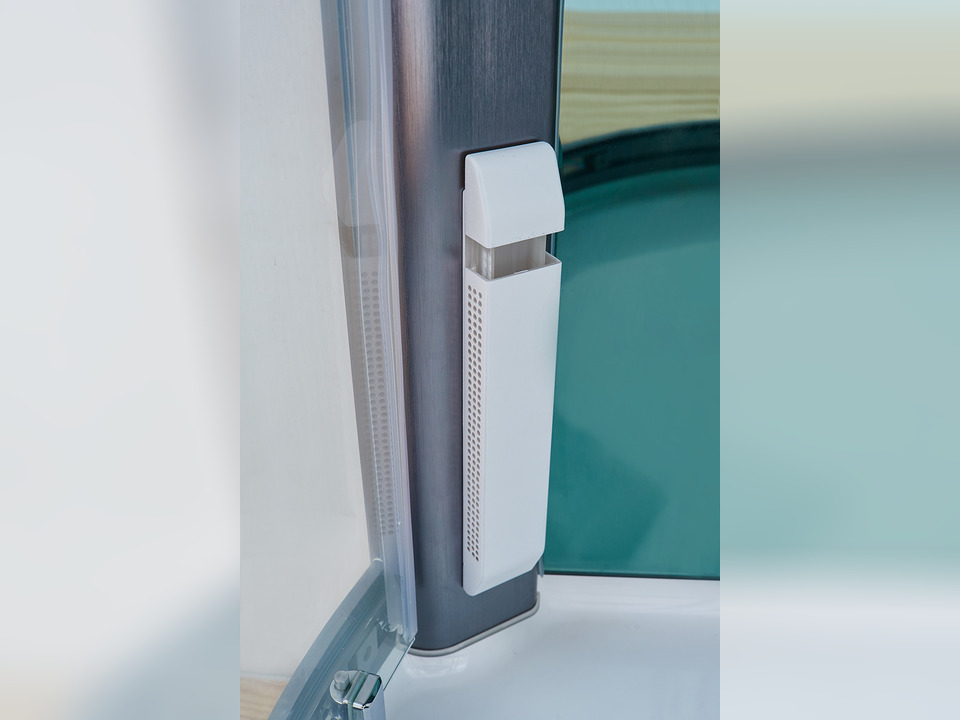 Ebenfalls im Hauptpanel verbaut ist die verchromte Messing-Armatur. Durch den Umsteller können Handbrause, Regenbrause oder die Körperdüsen angesteuert werden. So können Sie beispielweise nach einem Dampfbad den Körper nochmal mit den Körperdüsen reinigen oder bei der morgendlichen Dusche einfach nur unter dem tropischen Regen der Regenbrause stehen. Unmittelbar unter der Armatur befindet ein Zugang für die Entkalkung des Dampfgenerators. Somit ist die Pflege ganz leicht von vorn vorzunehmen.